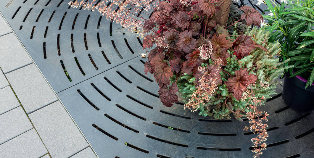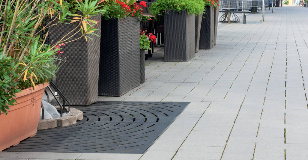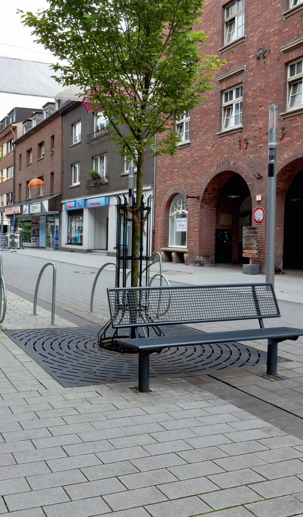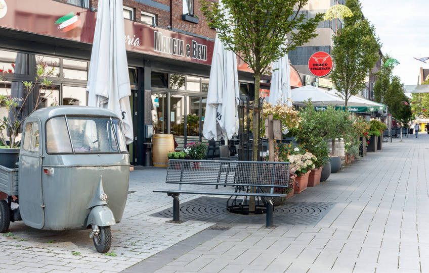 Objektbezogene Lösungen können mit MeierGuss Baumrostsystemen 2.0 umgesetzt werden. Die Guss-Baumroste wurden mit einem mittigen Gefälle in Bezug auf das Rinnen- und Straßenniveau verbaut. Auf diese Weise wird ein Schutz der Baumscheibe ohne störende Höhenunterschiede gewährleistet. Die Gastronomie kann die Flächen fast vollumfänglich nutzen.