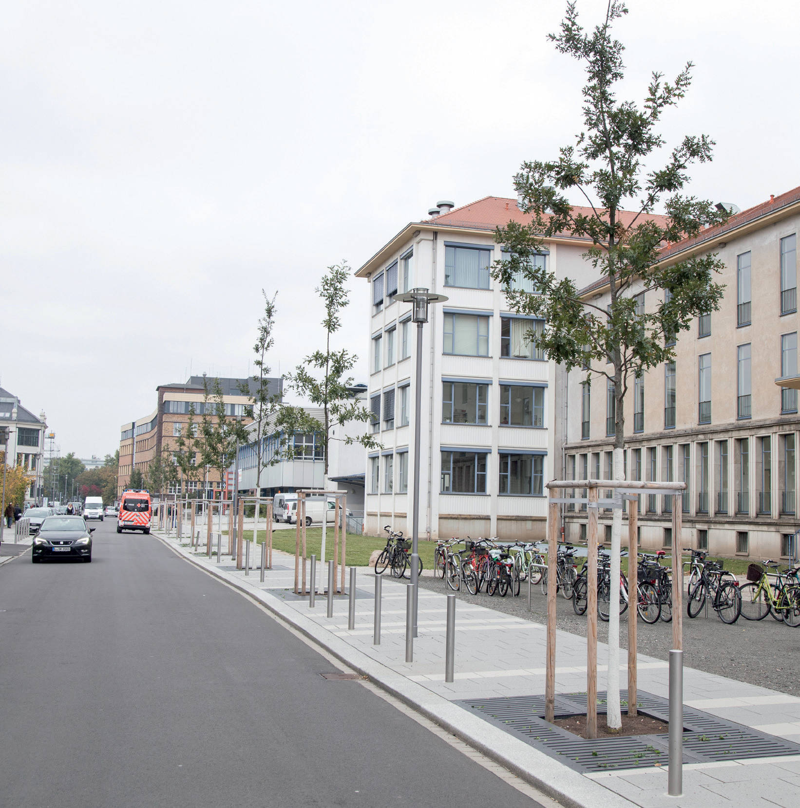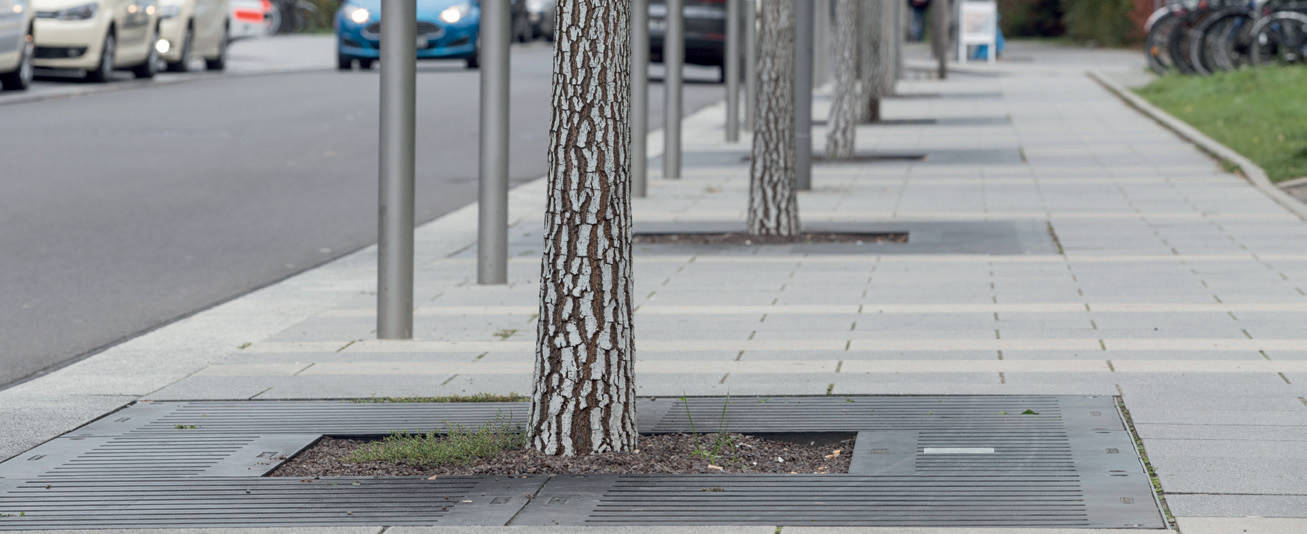 Baumscheibenabdeckungen von 6 m² wurden gemäß den Anforderungen der DIN 18916 sowie der FLL (Forschungsgesellschaft Landschaftsentwicklung Landschaftsbau e.V.) gewählt und sorgen dank des Lineardesigns LATERAL® für eine klare Linienführung.