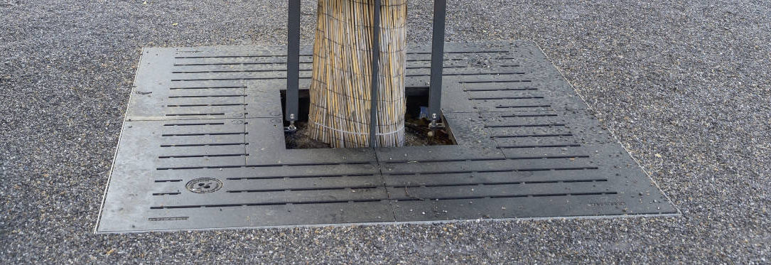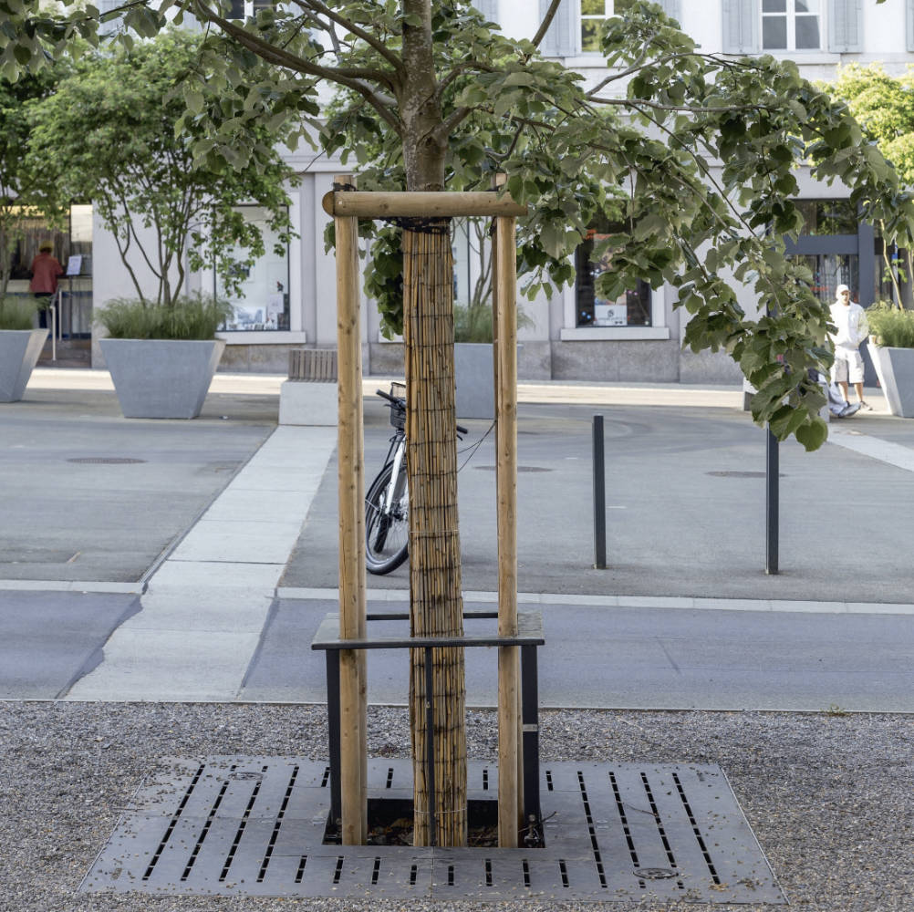 Sanierung und Aufwertung der Begegnungszone am Postplatz in Zug. Die gewählten LATERAL® 2.0 Baumroste sind optimal für Neupflanzungen und Bestandsbäume geeignet, da die Innenöffnung dem wachsenden Stammdurchmesser angepasst werden kann.